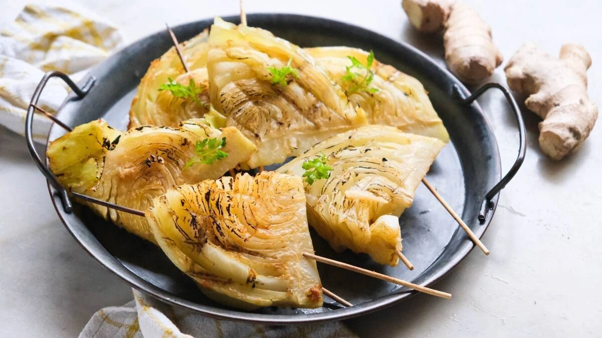 Стейк из белокочанной капусты с кунжутным маслом на шпажке