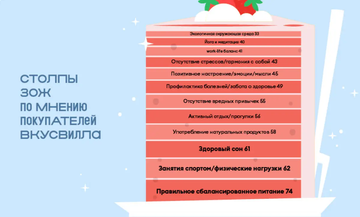 Не курить; съедать не меньше 400 граммов овощей и фруктов ежедневно; давать себе не меньше 150 минут умеренной (или 75 минут интенсивной) физической нагрузки в неделю; съедать не больше 5 граммов соли в день, а ещё умеренно употреблять алкоголь (не больше 168 г чистого спирта в неделю для мужчин и не больше 84 г для женщин) — таковы критерии ЗОЖа у Росстата. А как представляют себе ЗОЖ наши покупатели, расскажем ниже.