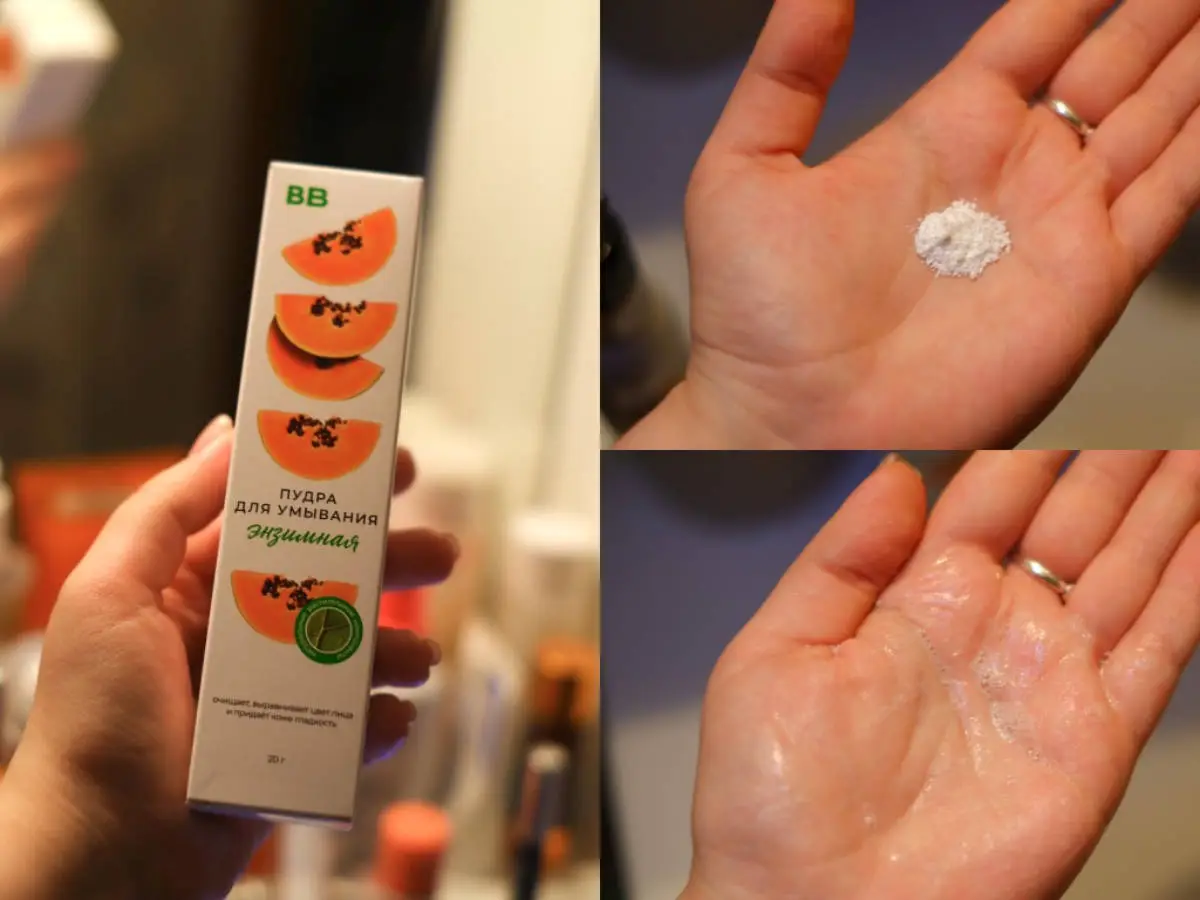 В чём преимущество такого средства: нет механического воздействия на кожу, пудра очищает её с помощью энзимов, которые растворяют загрязнения и излишки себума. Приятное ощущение чистоты, без стянутости.