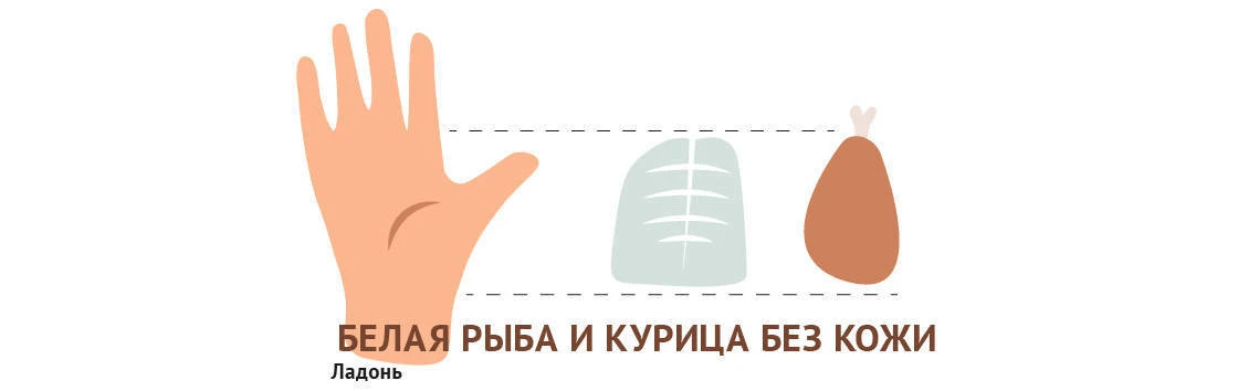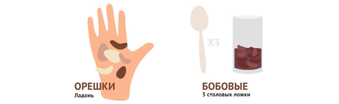 1 порция — это ваша ладонь (мясо, рыба) или горсть (орехи, бобовые).