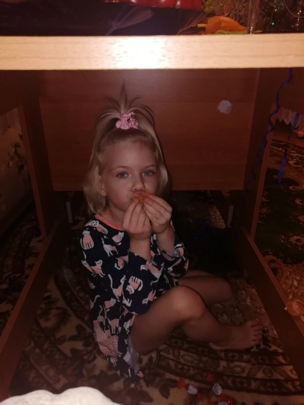 Кстати, свекровь в нынешнем году тоже продала ту квартиру, и угадайте, какова судьба этого стола. Ну да, он остаётся на обжитом месте. Мы шутим, что это уже не стол, а несущая конструкция. Дети очень любят проводить время под ним, когда взрослые отмечают праздник. Вот, например, моя дочь».
