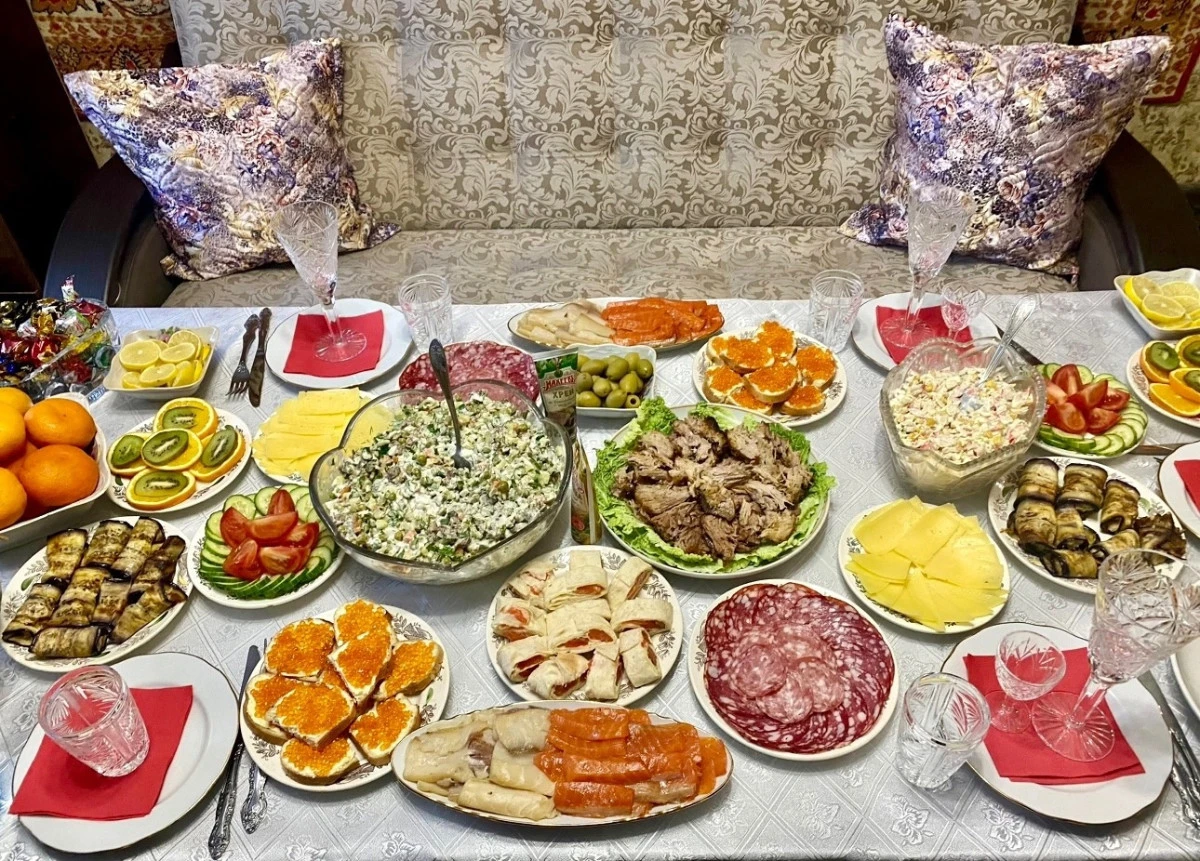 Я была ребёнком, и мои глаза от вида яств разбегались. Тут тебе и селёдка под шубой, и оливье, и заливное, и холодец, и утка в апельсинах! Ох, как вспомню! Или я была такая маленькая, а деревья были большие, и это всё роскошество моё детское воображение придумало. Помню точно, что вся еда была очень вкусной, её было много, и каждое застолье заканчивалось тортом!»