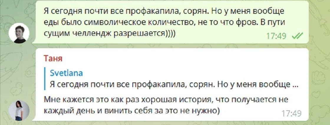— По итогам недели: включить в меню 5 порций овощей и фруктов не так уж сложно. В идеале, конечно, нужно 10, но теперь есть к чему стремиться.