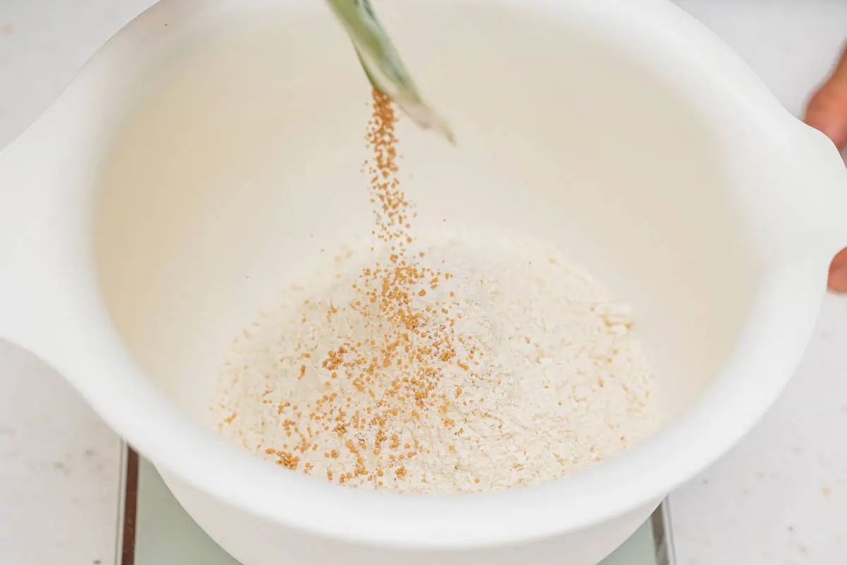 Поэтому сначала в большой миске соединяем муку, соль, сахар и дрожжи.