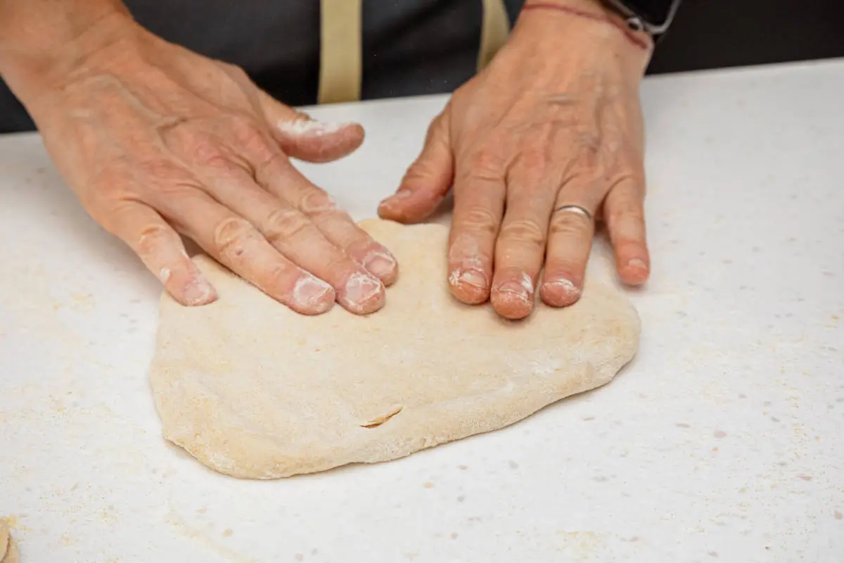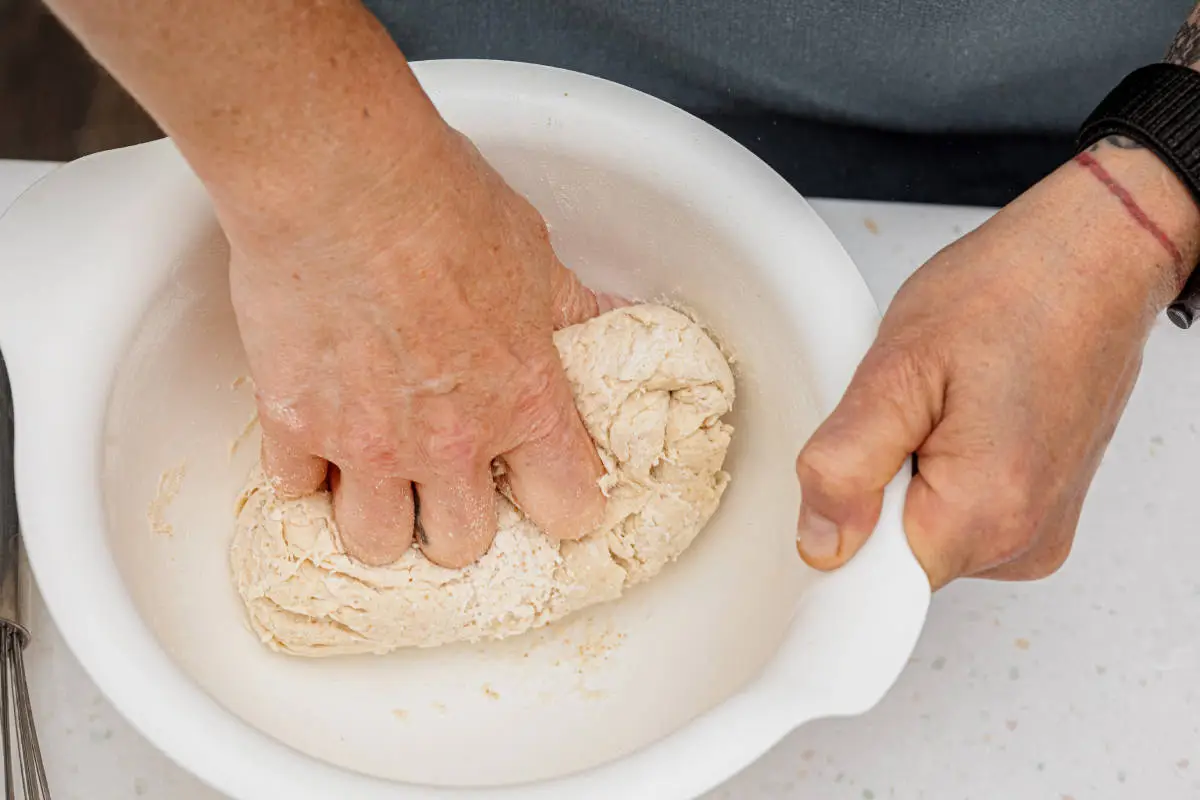 Не торопитесь досыпать муку в миску сверх положенного, если тесто липнет к рукам! Просто продолжайте месить: когда клейковина выработается, тесто перестанет прилипать. Так вы и поймёте, что замес окончен.