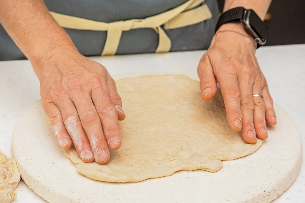Придаём растянутому тесту максимально круглую форму так, чтобы не оставалось слишком тонких или излишне толстых мест.