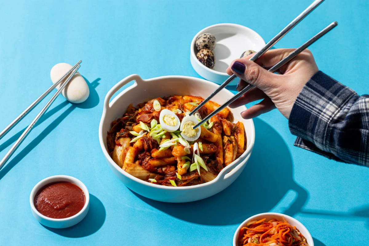 Рисовые клёцки токпокки (ттокпокки, токпоки) — одно из самых популярных блюд корейского стритфуда. В нашумевшем сериале «Игра в кальмара» дочь главного героя называет токпокки своей любимой едой. Существует множество вариаций токпокки: их можно подавать с острым бульоном, сливочным соусом, сыром, овощами или морепродуктами. Мы приготовили пикантную версию этого блюда с кимчи, беконом и варёным яйцом.