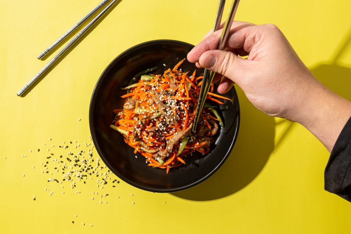 Рецепт салата из маринованного мяса наш бренд-шеф Артём Калитвинцев буквально воссоздал по мотивам своих воспоминаний из детства, когда мама готовила это блюдо на каждый праздник. Для хе очень важно правильно подобрать мясо — выбирайте самые нежные кусочки без жёстких волокон.