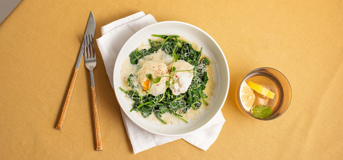 - Сервируйте блюдо: на припущенный шпинат выложите яйца пашот, полейте соусом бешамель и посыпьте тёртым пармезаном. По желанию украсьте микрозеленью.