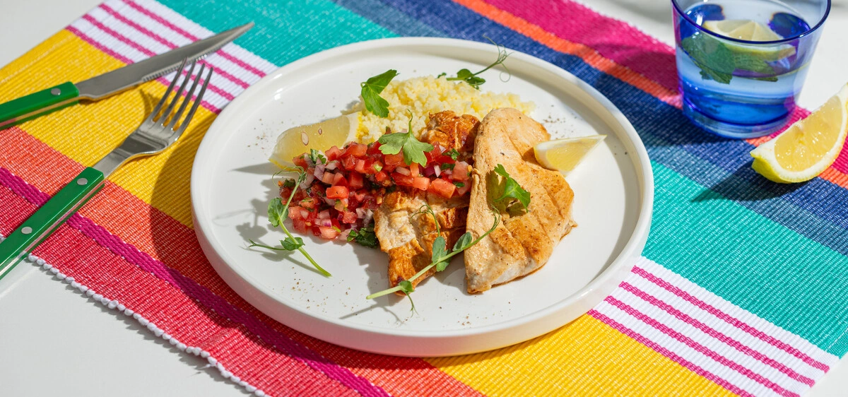 - Подавайте кусочки курицы с кускусом, сальсой и долькой лимона.