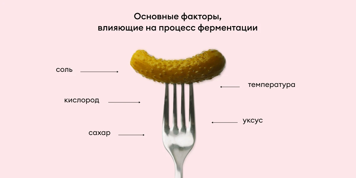 Мы можем повлиять на свойства среды: добавить соль, сахар, кислоту (например, уксусную), понизить или повысить температуру, открыть или ограничить доступ кислорода, заливая раствор или оставляя наш продукт под гнётом. Ускоряет процесс тепло (20–40 градусов), влажность, наличие сахара в умеренном количестве и доступ кислорода. В такой питательной среде микроорганизмы чувствуют себя отлично: и те, что нам нужны, — назовём их хорошими, и плохие. Ведь ферментация в определённой степени — гниение. Поэтому чаще всего схема выглядит так: запускаем процесс, доводим его до нужного нам состояния и затем пытаемся замедлить, чтобы сохранить итоговый продукт.