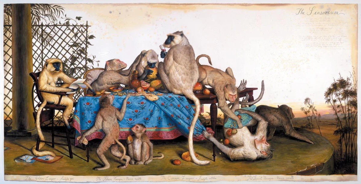 Если посмотреть на работы американского художника-натуралиста Уолтона Форда, может показаться, будто он просто добавил абсурда в иллюстрации из учебника биологии. На картину «Сенсориум» мастера вдохновил исследователь Африки и лингвист Ричард Бёртон, живший и работавший в XIX веке. Он знал много языков и мечтал освоить обезьяний. Чтобы составить такой словарь, Бёртон поселил в своём доме 40 приматов. Одним из развлечений для него и его «подопечных» были трапезы. Учёный организовал столовую, где обезьяны рассаживались по стульям, у каждой была своя посуда, еда и напитки. Всю лингвистическую работу Бёртона, к слову, уничтожил пожар, к тому моменту в обезьяньем словаре было 60 слов.