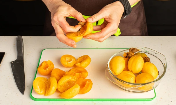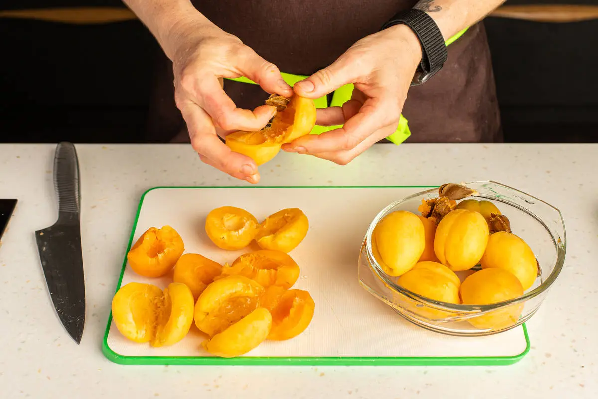 Абрикосы разрежьте на половинки и удалите косточки.