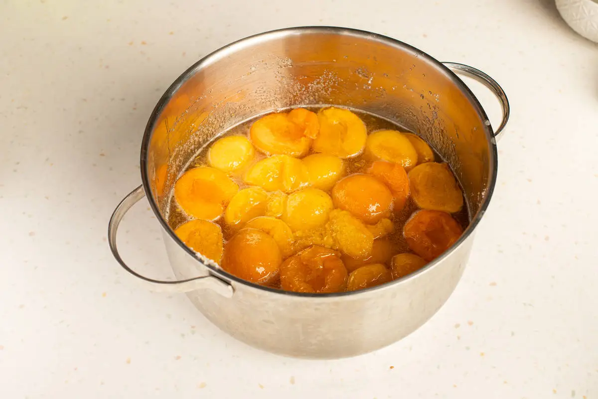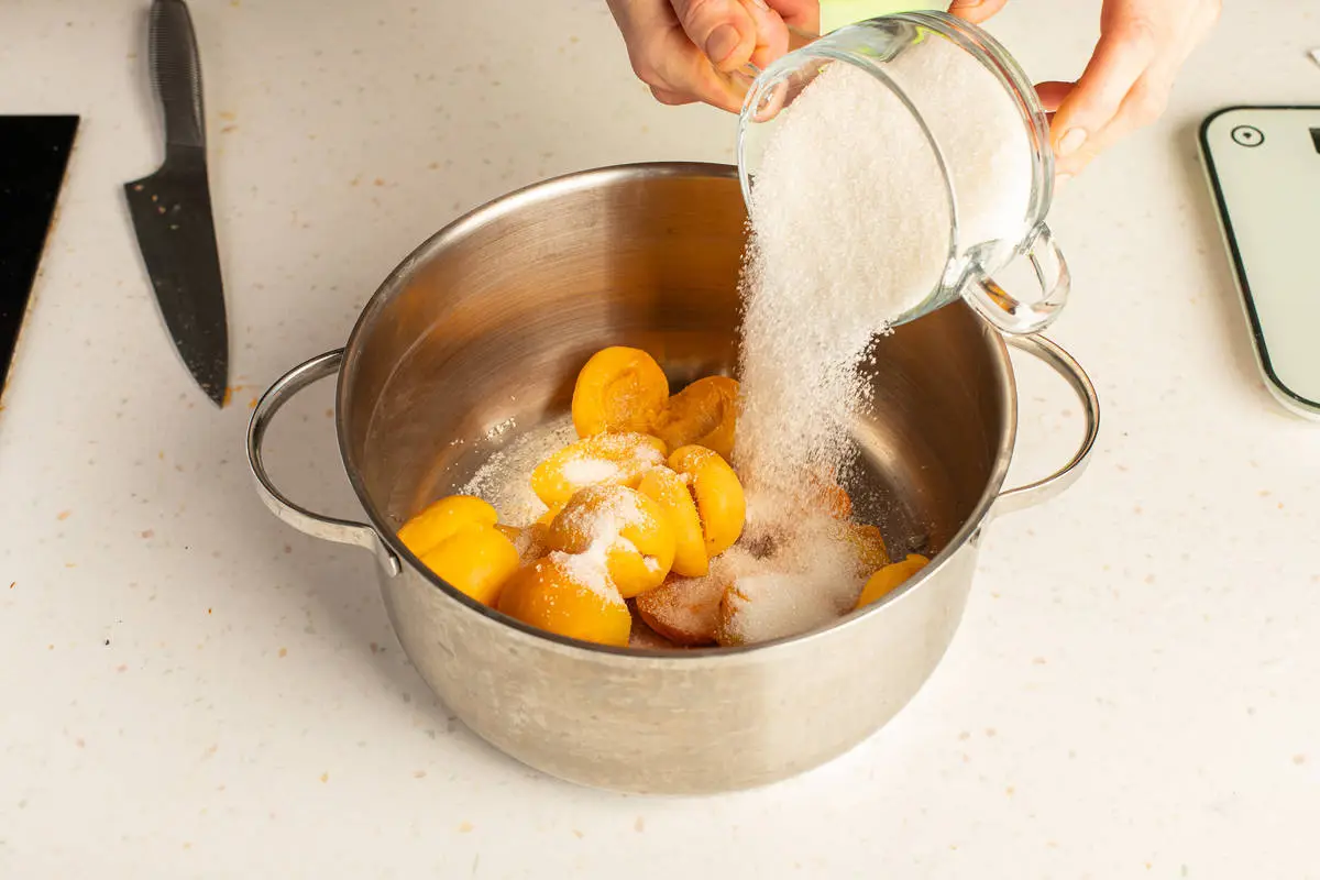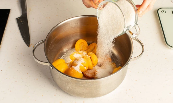 Засыпьте плоды сахаром и оставьте на ночь, чтобы абрикосы дали сок.