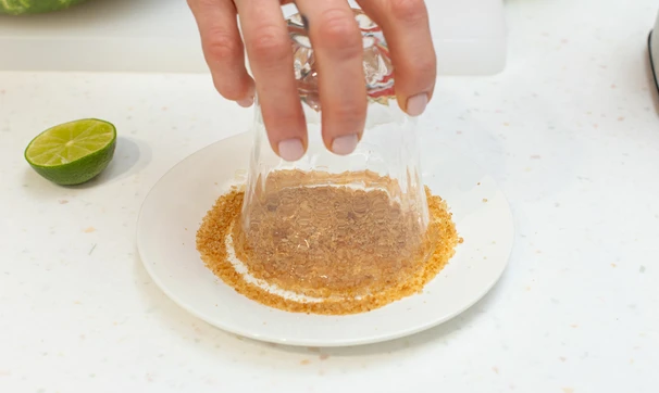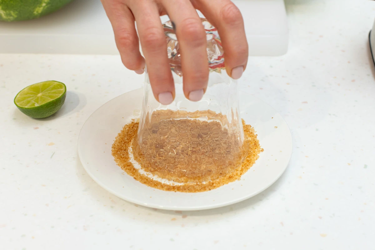 Насыпьте немного сахара на плоскую тарелку. Смочите края стаканов водой или соком лайма и окуните в сахарный песок, чтобы получились сахарные ободки.