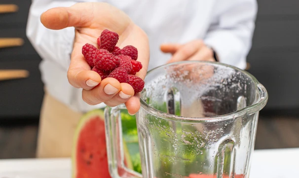 Оставшуюся мякоть арбуза выложите в блендер, добавьте листья мяты, малину, измельчите. При необходимости также процедите через сито.