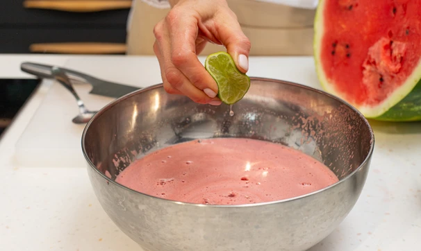 Смешайте измельчённый с водой арбуз и измельчённый с малиной и мятой арбуз, добавьте сок лайма по вкусу, перемешайте.