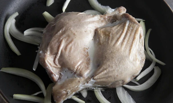 Окорочка достаньте из упаковки, выложите в сковороду вместе с жиром, добавьте лук и готовьте на небольшом огне под крышкой, пока варится рис.
