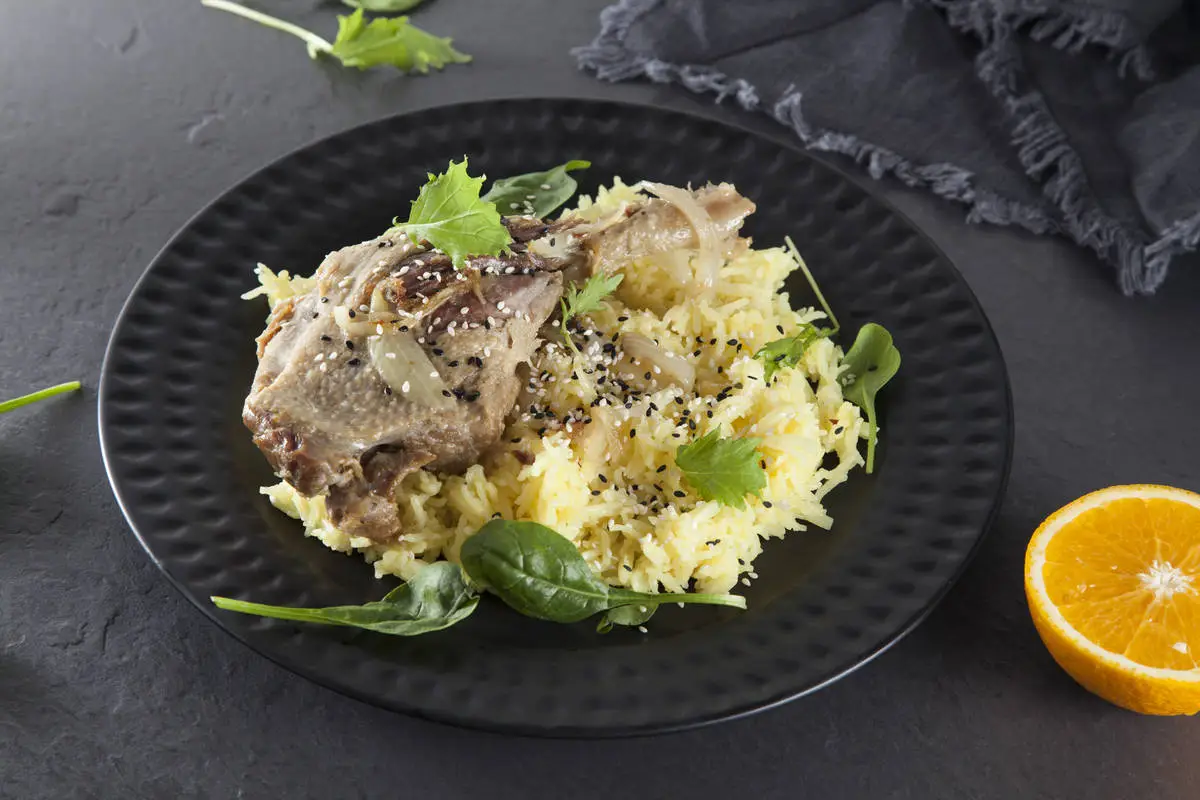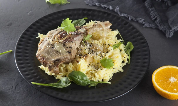 Апельсиновый рис с уткой конфи