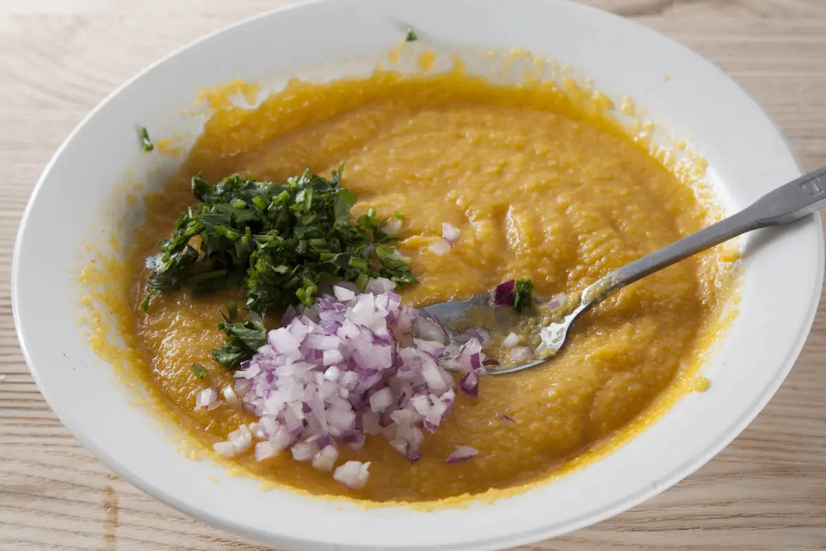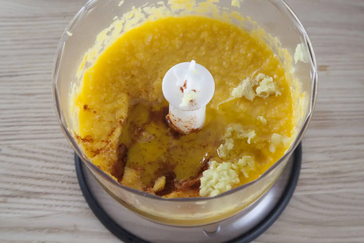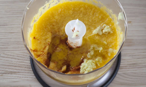 Половину манго очистите от кожуры, нарежьте произвольно и положите в чашу блендера, добавьте оливковое масло и лимонный сок, пробейте до однородно массы. Добавьте тертый корень имбиря и острый молотый перец, посолите по вкусу.