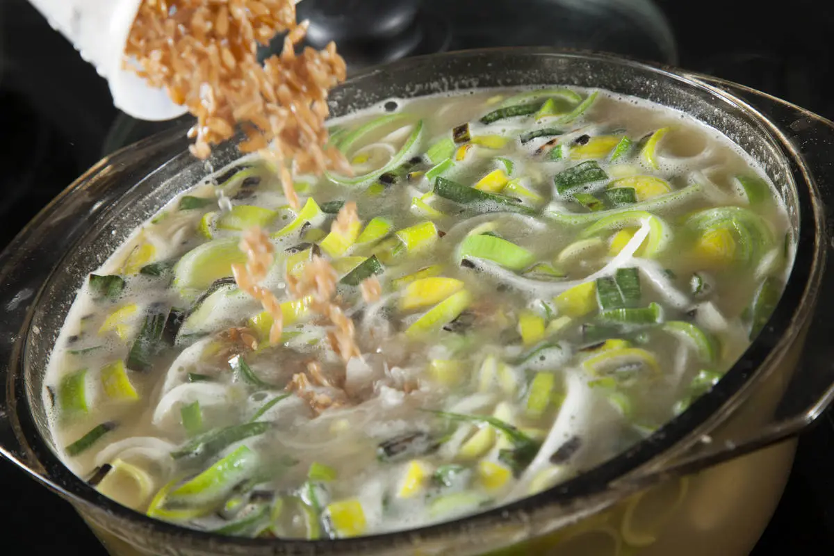 Лук-порей промойте и порежьте кольцами. Зеленую более грубую часть можно подпечь на сухой сковороде до легких подпалин – для печеного привкуса. Лук залейте холодной водой (1,5 – 2 литра) и варите на среднем огне.