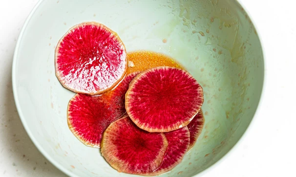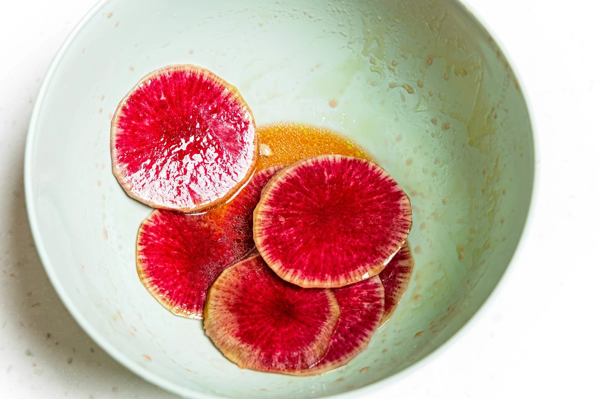 Сложите в миску, выдавите сок из половинки лимона. Перемешайте редьку с лимонным соком, оливковым маслом и солью и оставьте на 15 минут.