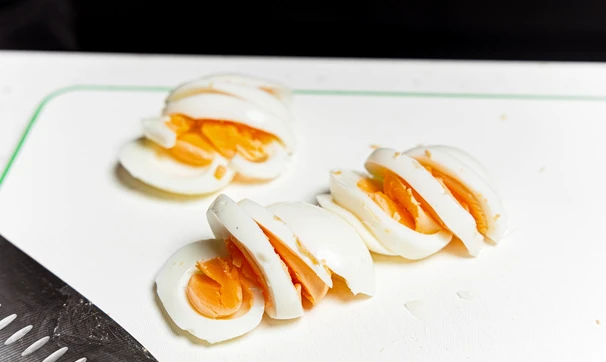Яйца сварите вкрутую, остудите, очистите от скорлупы. Нарежьте толстыми кружочками.