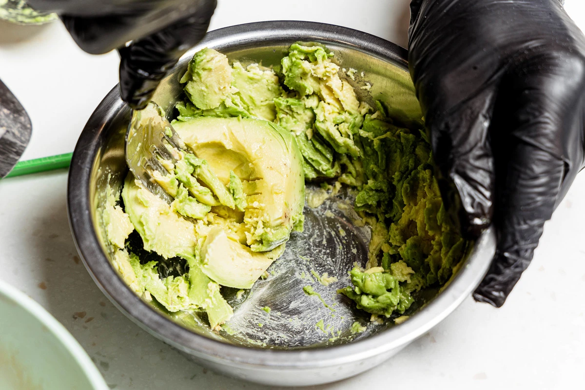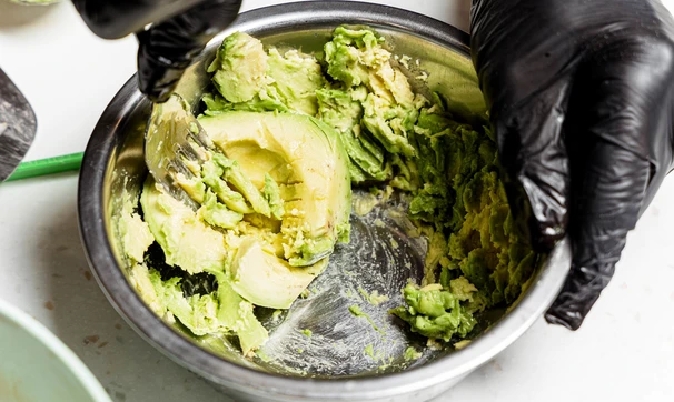 Мякоть авокадо разомните вилкой, добавьте немного маринада от редьки и перемешайте.