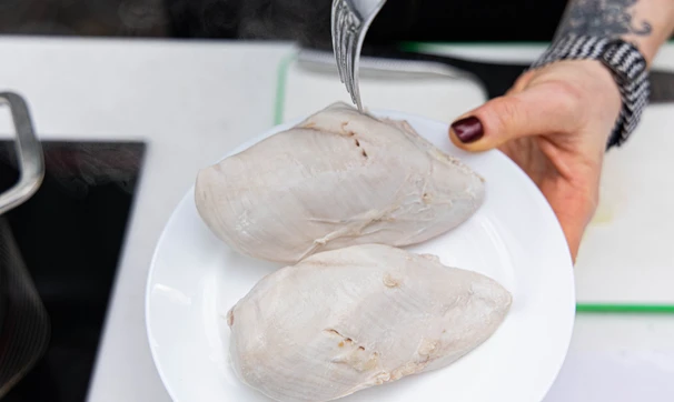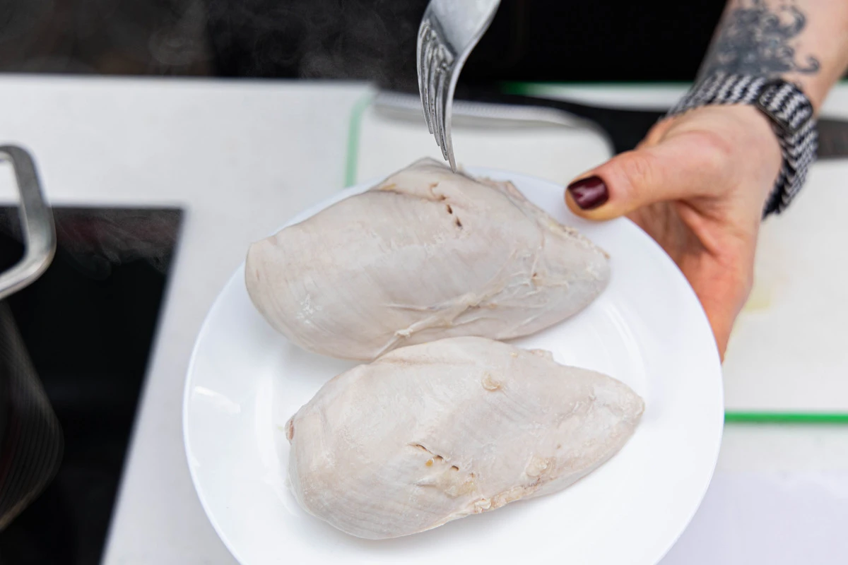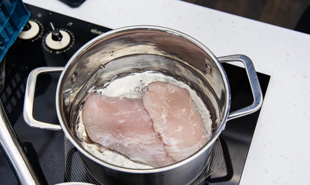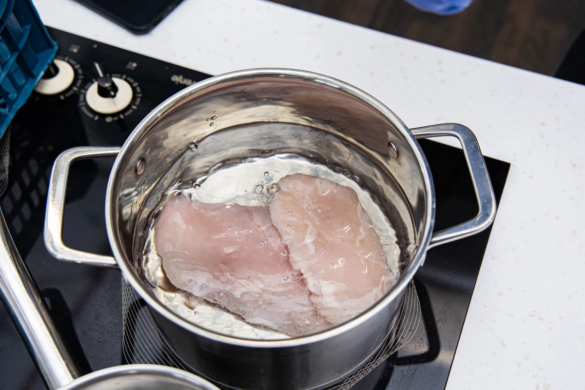 Куриное филе залейте 1,2 литрами воды, доведите до кипения, снимите пену. Убавьте огонь и варите при слабом кипении около 20 минут.