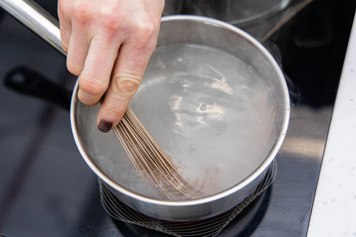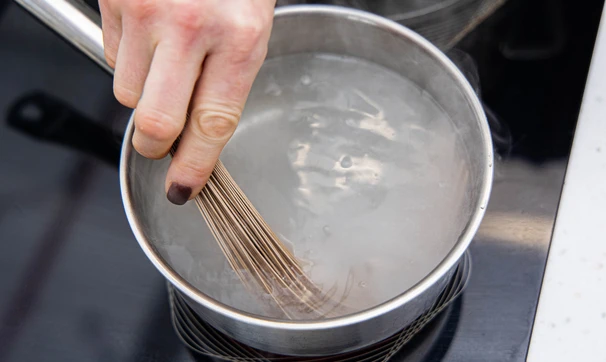 Параллельно в отдельной кастрюле вскипятите подсоленную воду и поставьте вариться собу.