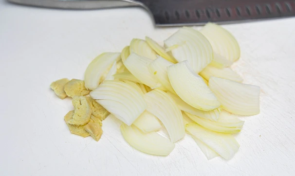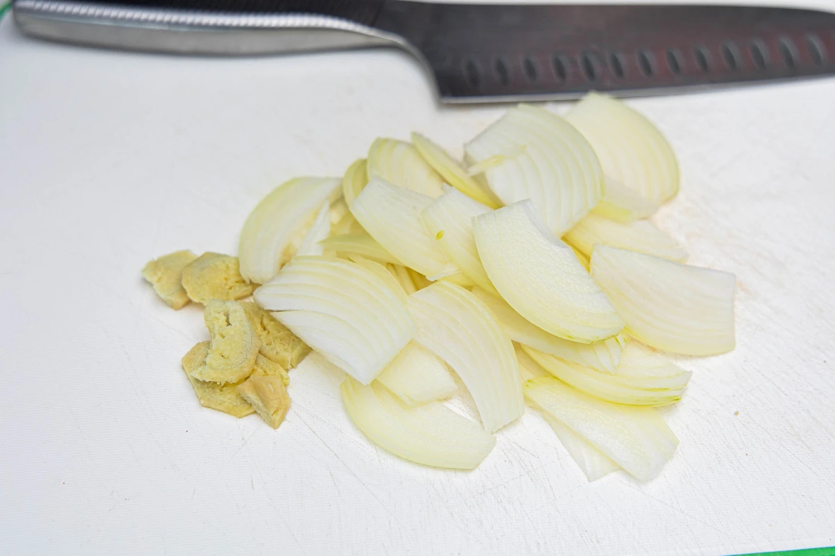 Очистите имбирь, лук и чеснок, у чеснока удалите сердцевинку. Лук нарежьте тонкими перьями, имбирь — колечками, чеснок измельчите произвольно. Отрежьте несколько колечек острого перца. Грибы эноки разберите руками на небольшие удобные пучки. Кейл порвите руками.