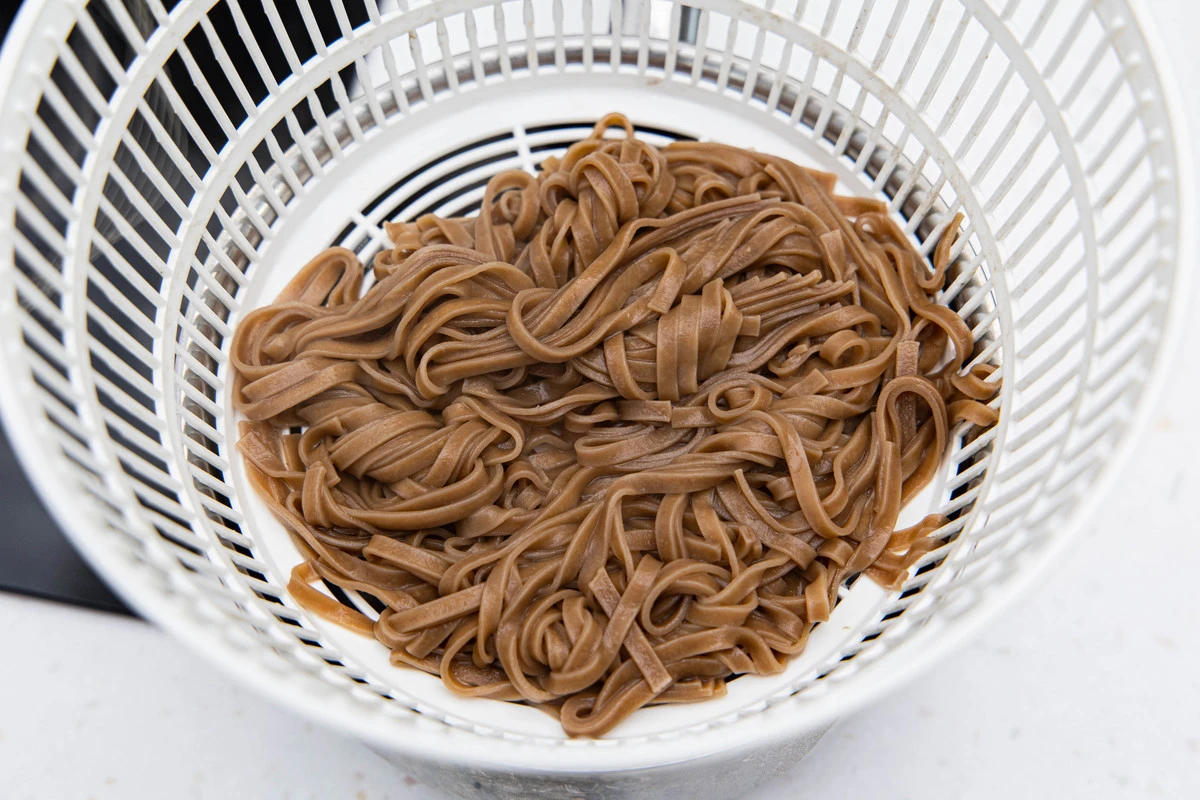 Лапшу откиньте на сито, промойте под струёй воды.