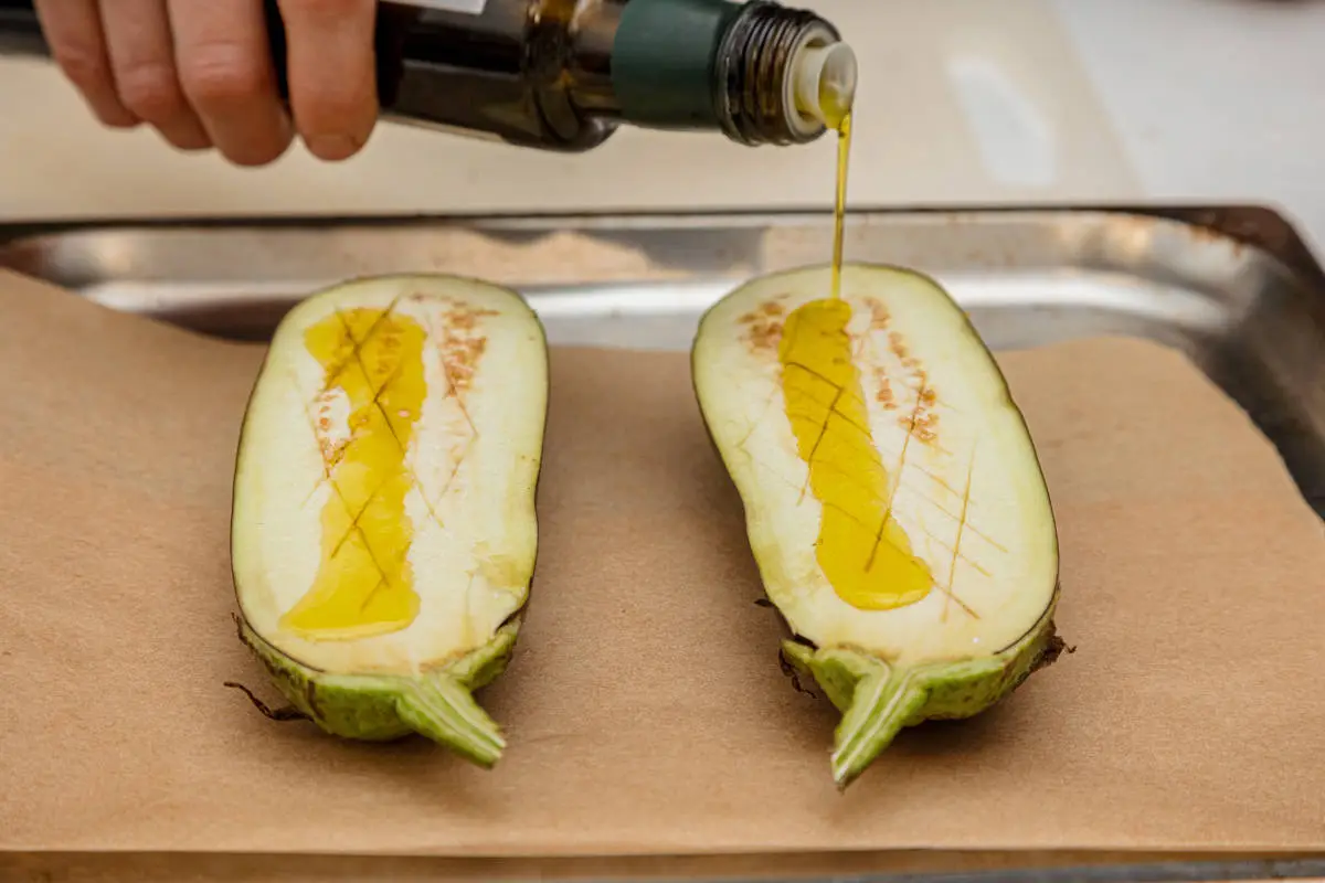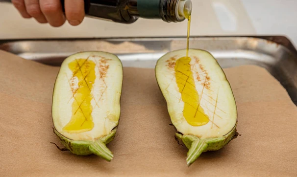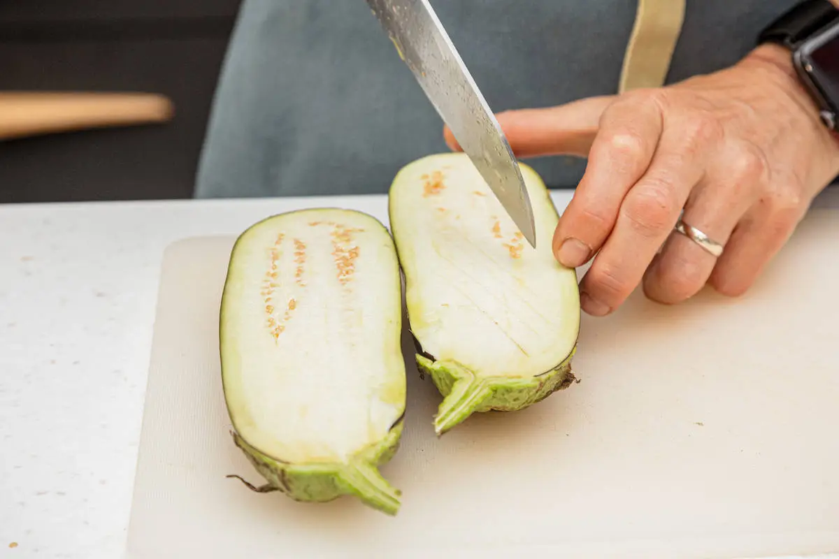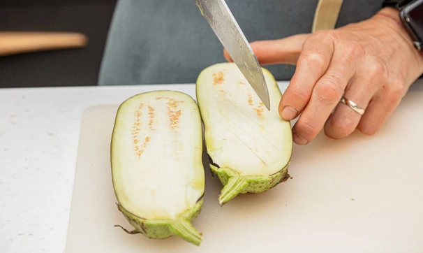 Баклажан разрежьте вдоль пополам, сделайте неглубокие надрезы на мякоти.