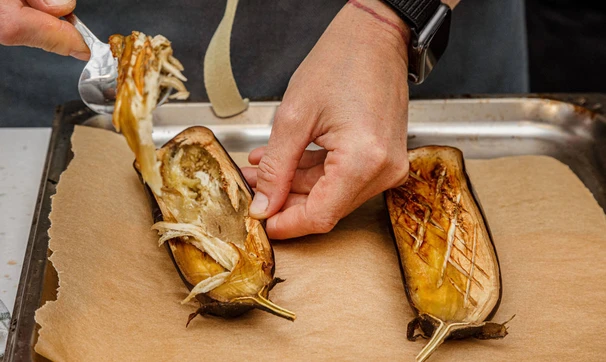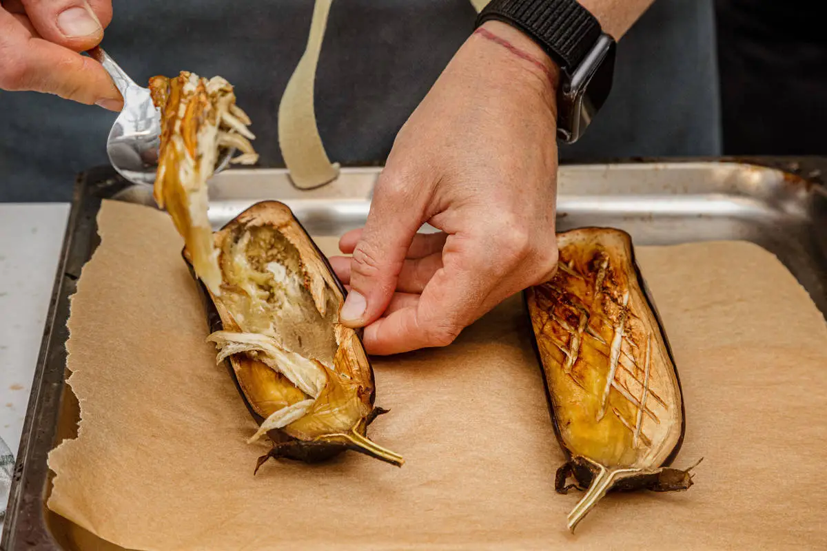 Аккуратно ложкой выньте мякоть из баклажанов, не повреждая кожуру.