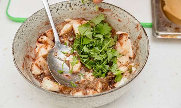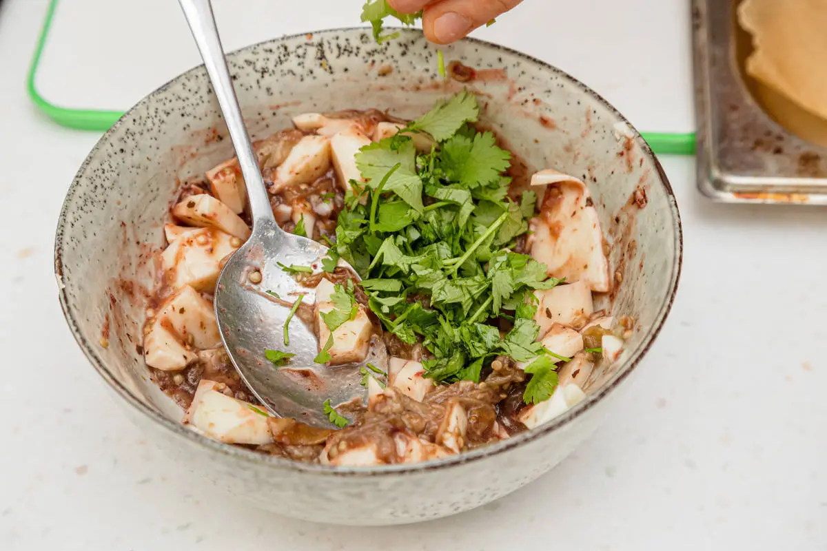 Мякоть измельчите, смешайте с сыром, ткемали и кинзой.