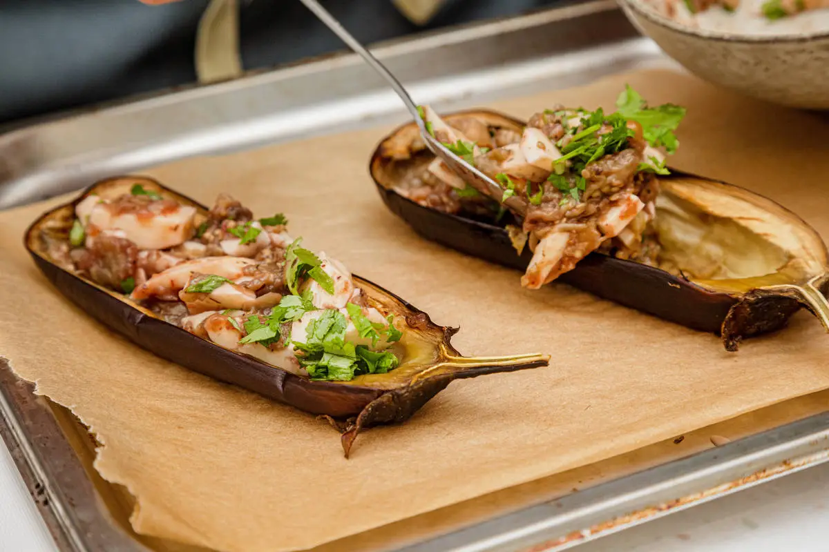 Получившуюся начинку выложите обратно в лодочки из баклажанов и поставьте их в духовку на 5 минут до расплавления сыра.