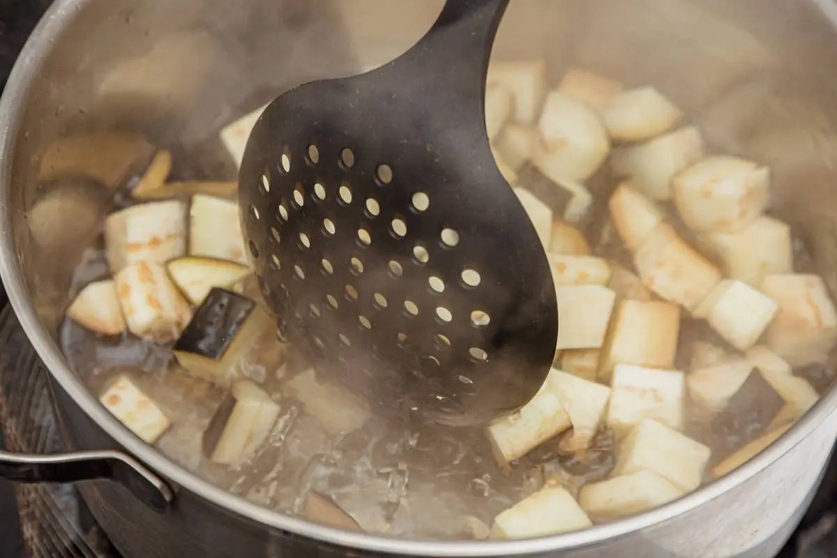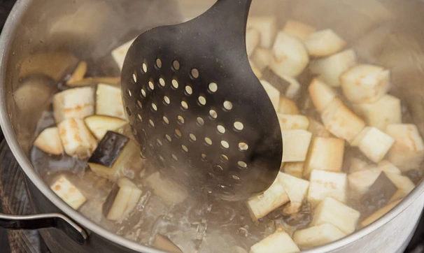 Вскипятите примерно 1 литр воды, бланшируйте баклажаны 3-4 минуты, откиньте на сито, дайте стечь воде.