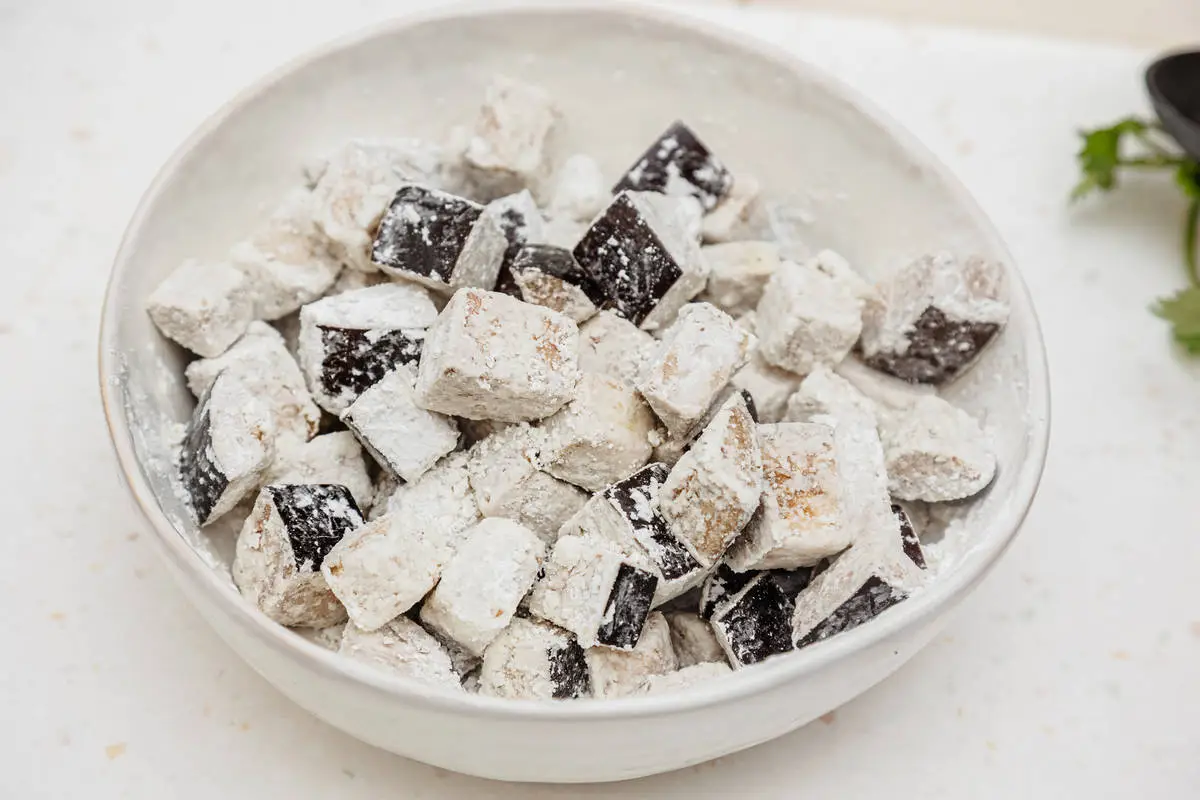 Затем обсушите кусочки баклажанов на салфетке и обваляйте в крахмале.