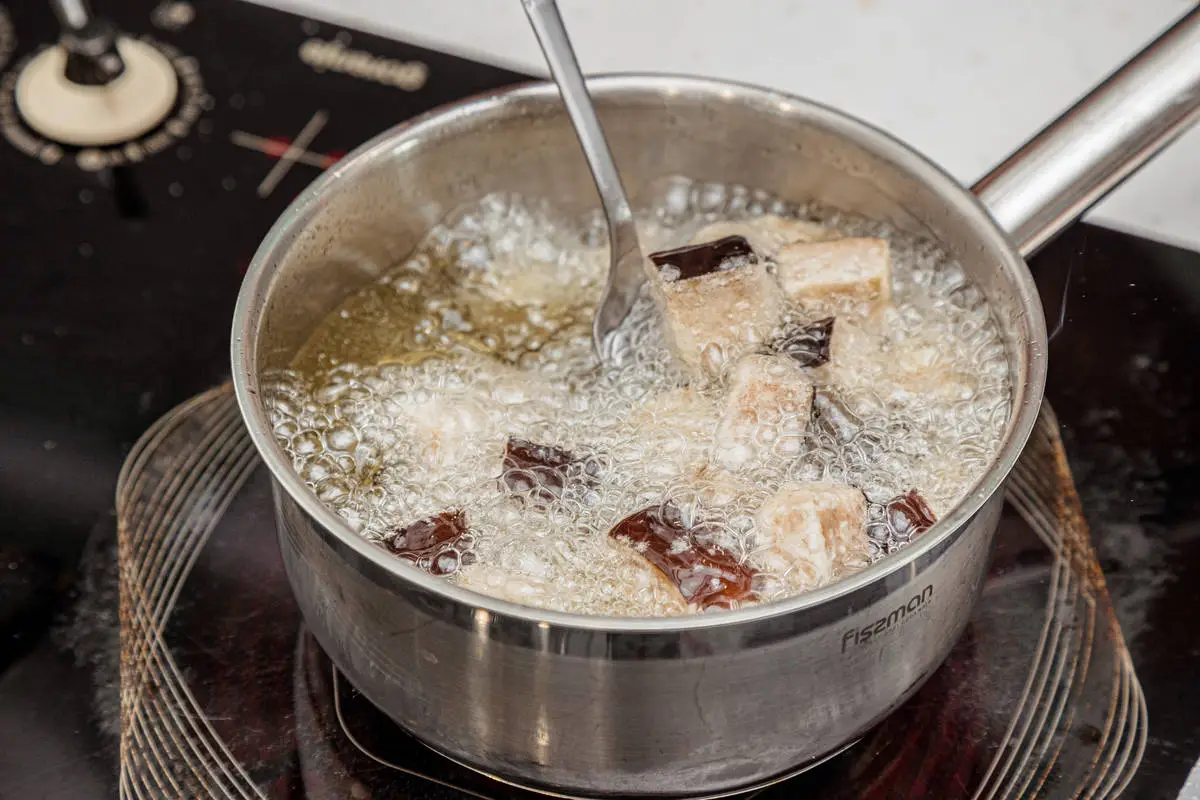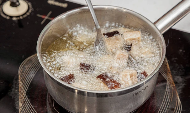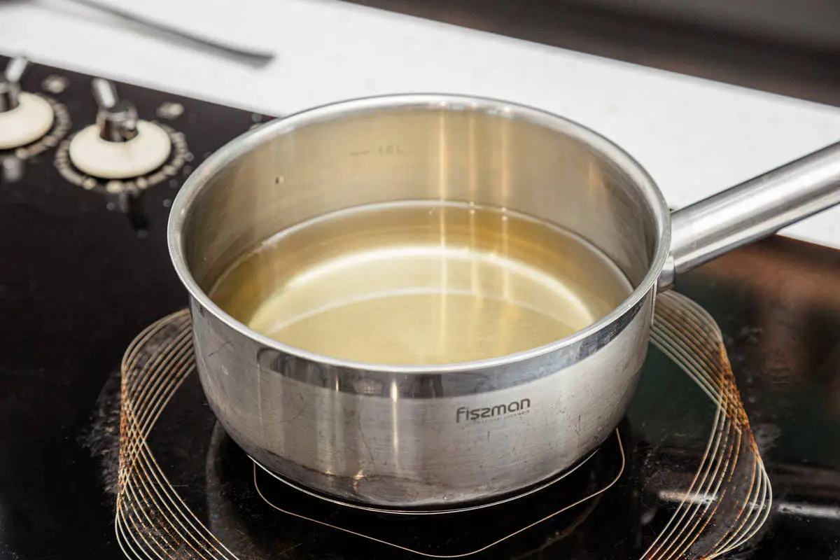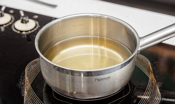Растительное масло налейте в сотейник или глубокую сковороду и нагревайте, пока в толще масла не перестанут быть видны перемешивающиеся слои разной температуры.
