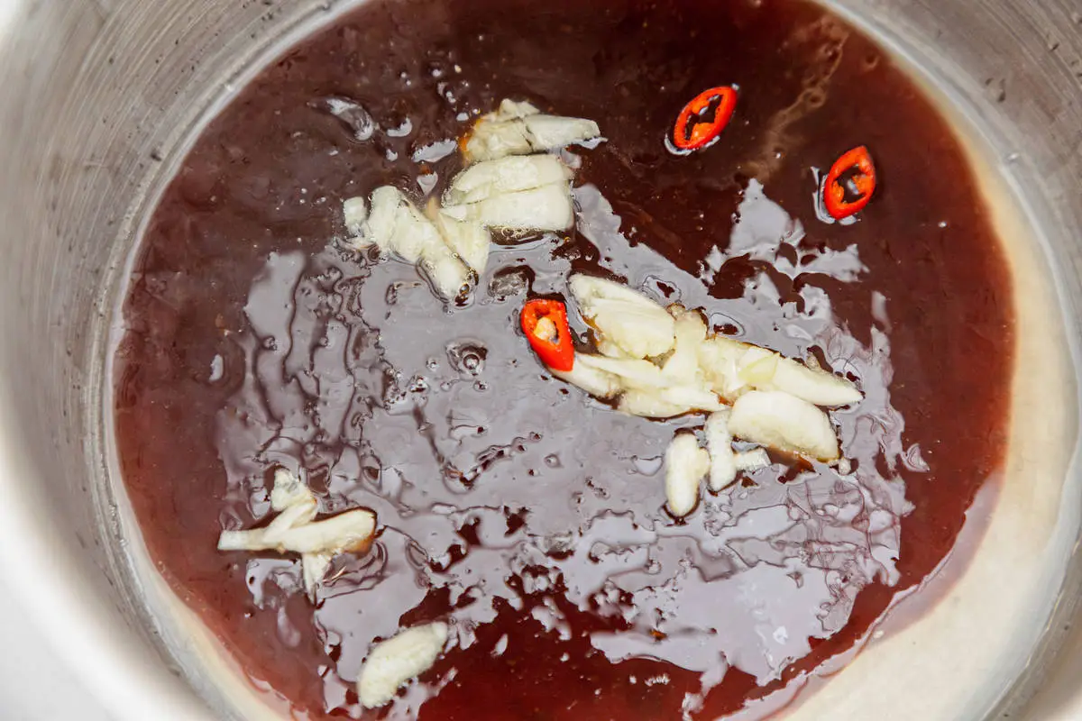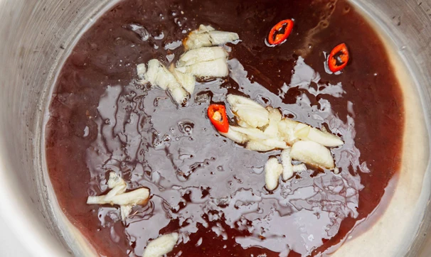 В сотейнике соедините соус терияки, добавьте сок лайма, измельчённый чеснок и пару колечек острого перца. Прогрейте соус, не доводя до кипения.