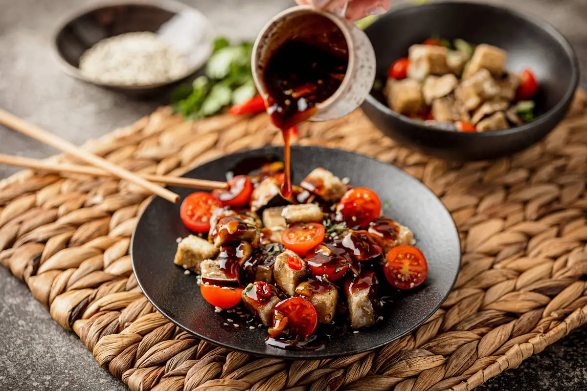 Черри нарежьте половинками, выложите в тарелки, сверху положите баклажаны и залейте всё горячим соусом. Украсьте кинзой и сразу подавайте. Важный нюанс: не перемешивайте баклажаны с соусом заранее, чтобы сохранить хрустящую корочку.