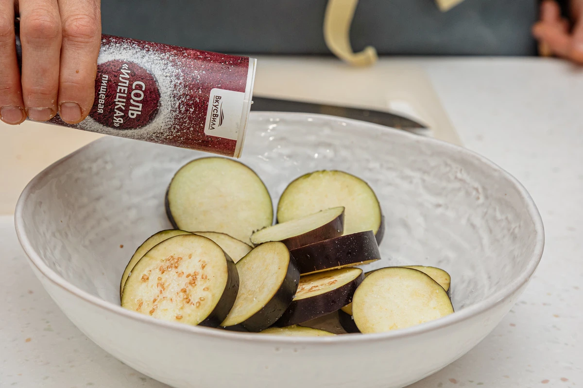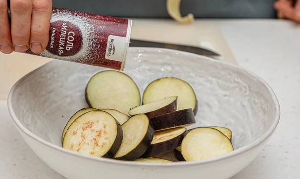 Баклажан нарежьте толстыми кольцами, посолите и оставьте на 10 минут. Слейте выделившийся сок.