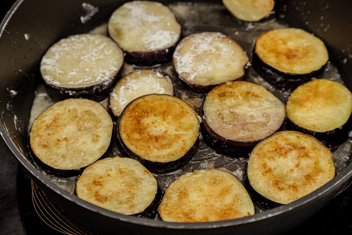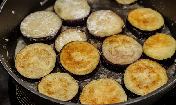 Пожарьте на растительном масле на горячей сковородке. Выложите готовые баклажаны на салфетку, чтобы впиталось лишнее масло.