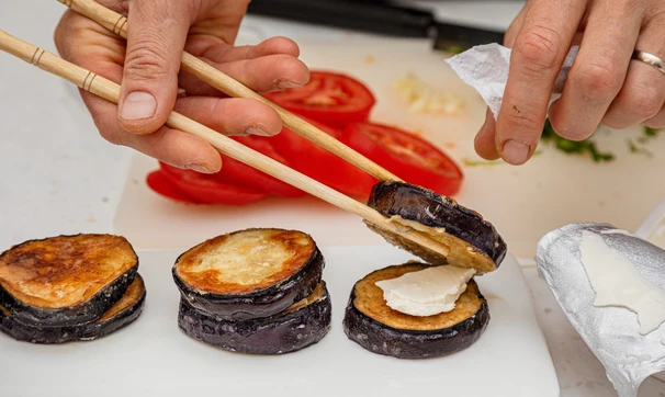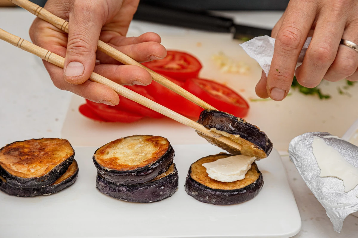 Кружок баклажана намажьте сыром, сверху положите ещё один баклажан.