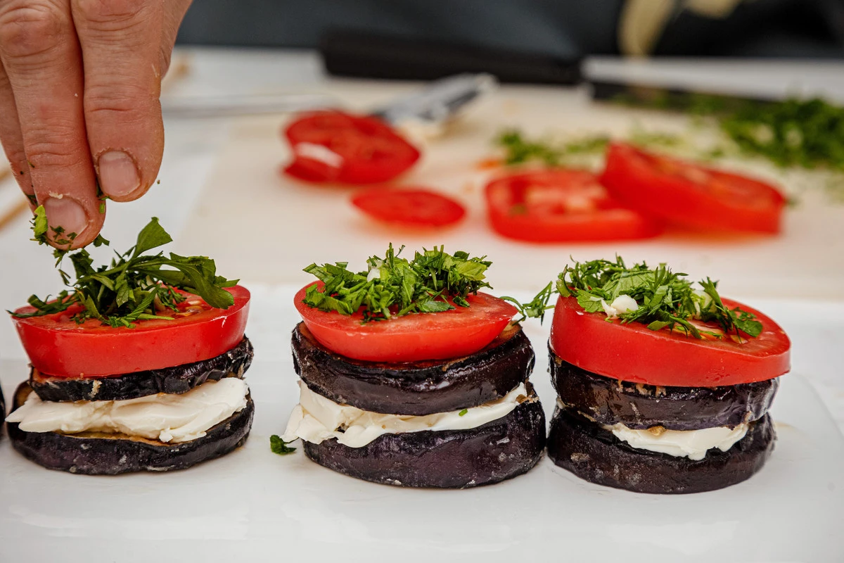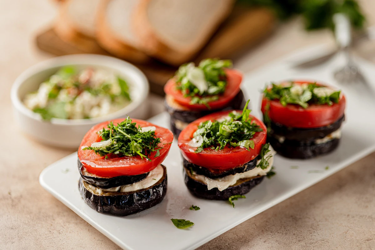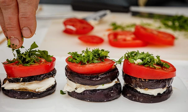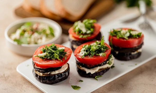 Соберите оставшиеся «башенки» из баклажанов и помидоров и подавайте к столу. Можно также дополнительно посыпать свёрху тёртым сыром и запечь в духовке до его расплавления.