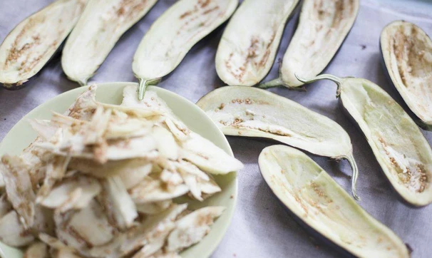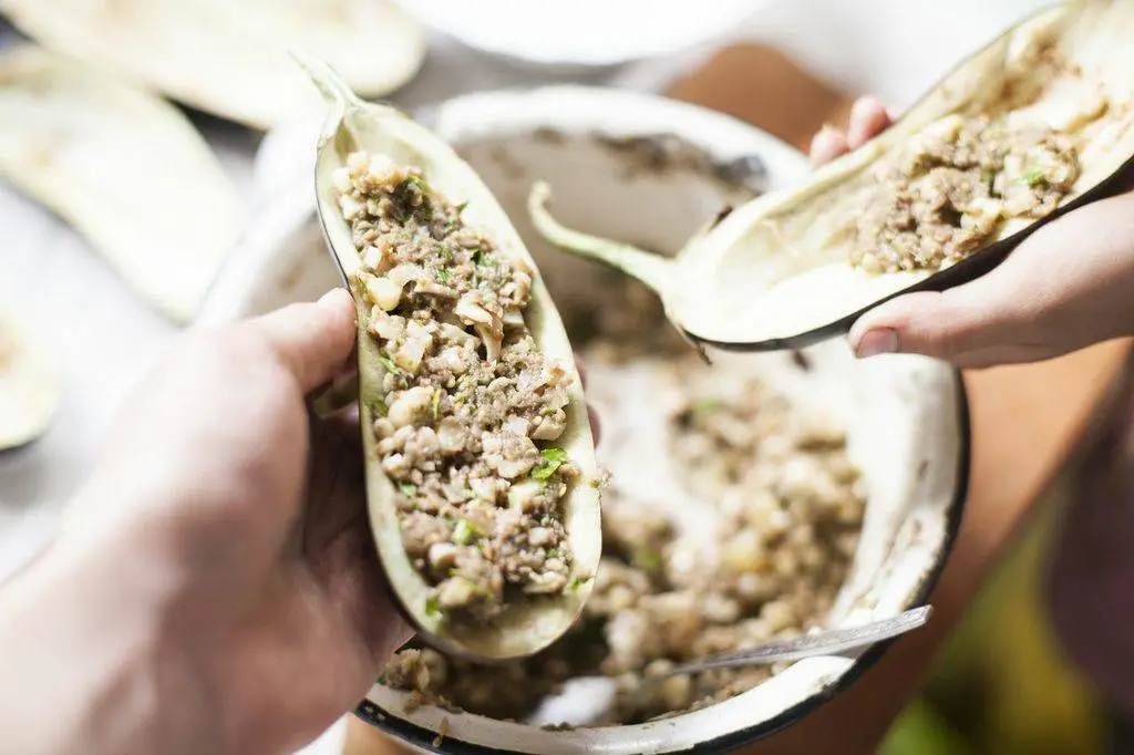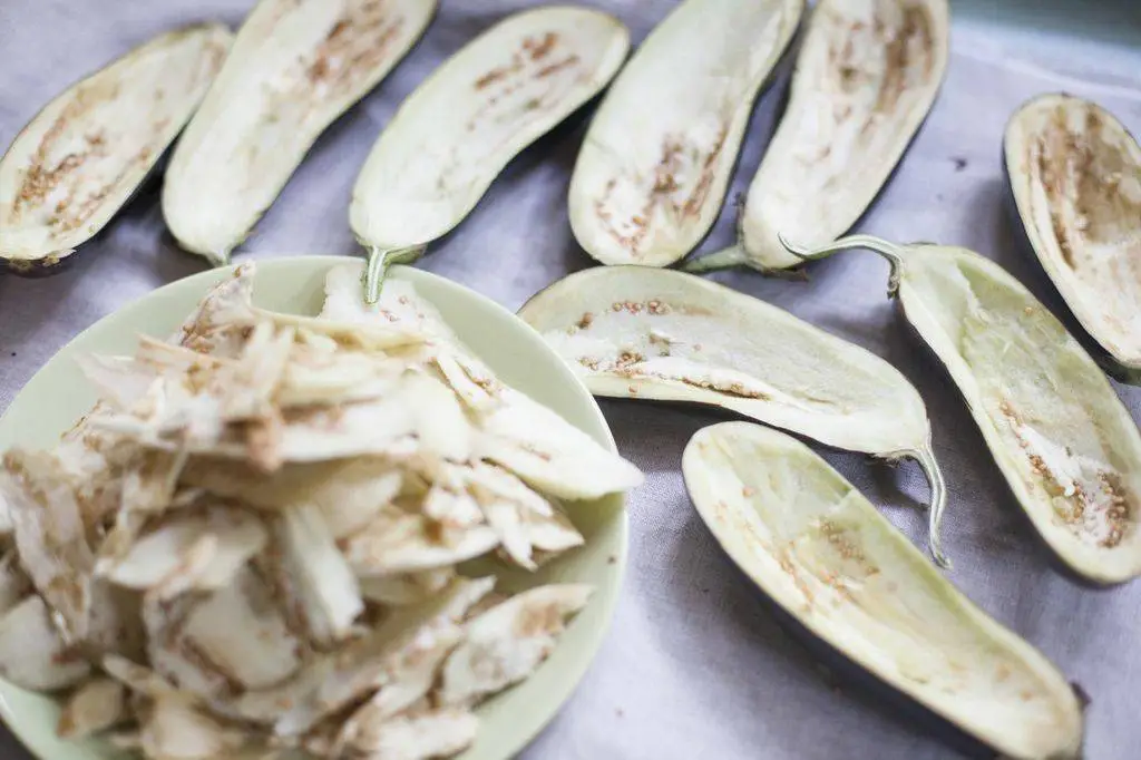 Баклажаны разрежьте пополам, аккуратно острым ножом вырежьте мякоть из середины.