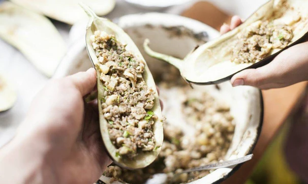 Получившимся фаршем наполните половинки баклажанов, запекайте в разогретой до 180С духовке 20-30 минут (до румяной корочки).