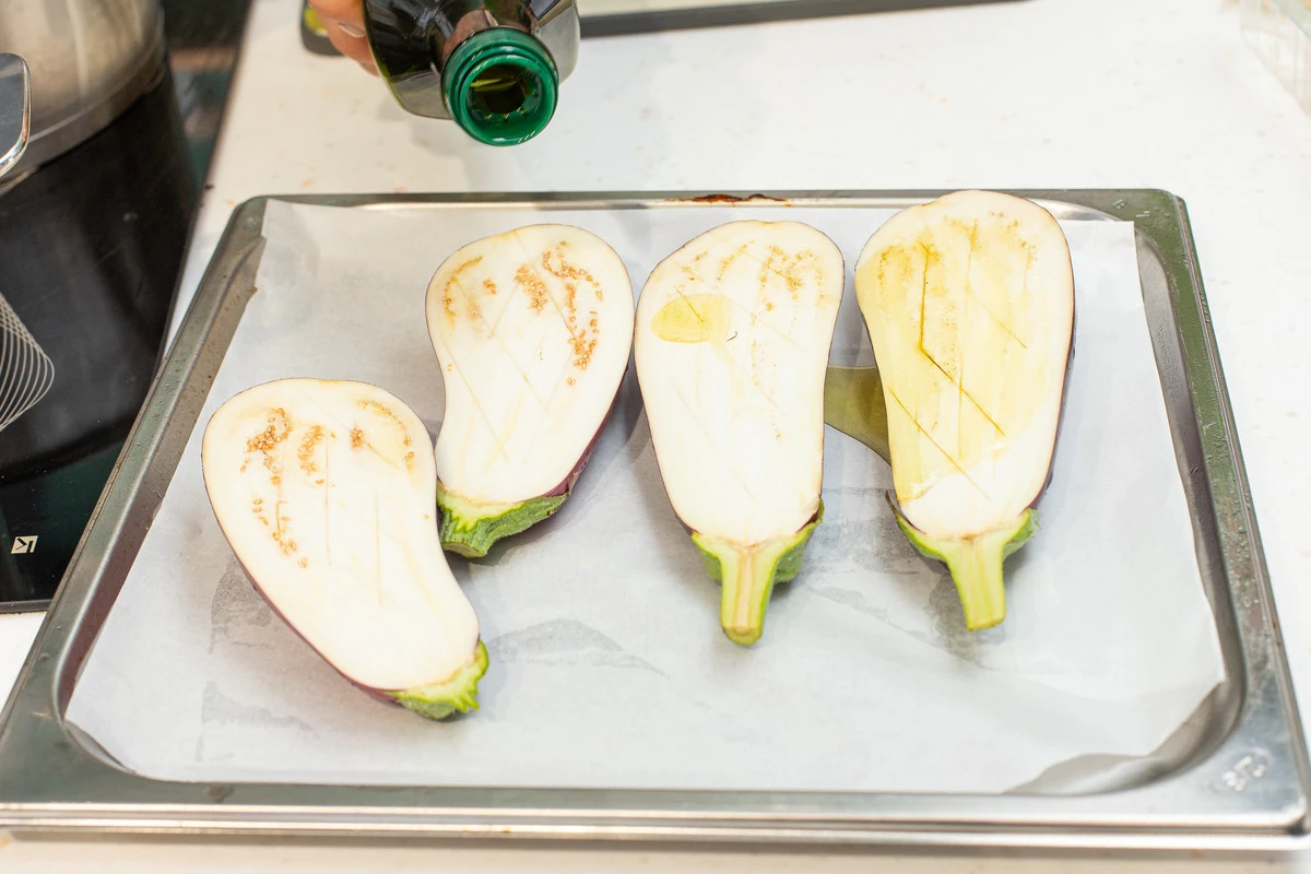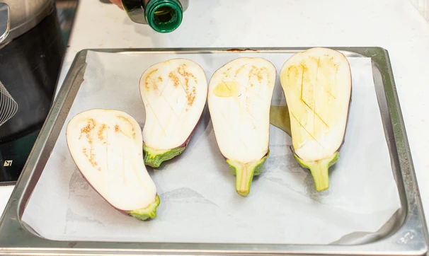Помойте баклажаны. Разрежьте пополам и выложите на застеленный пергаментом противень. На каждой половинке сделайте ножом насечки по диагонали, посолите по вкусу, слегка смажьте оливковым маслом. Запекайте 20 минут в разогретой до 180 ℃ духовке. По желанию накройте фольгой.