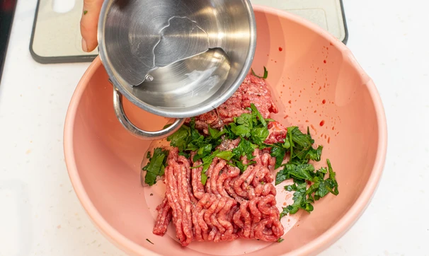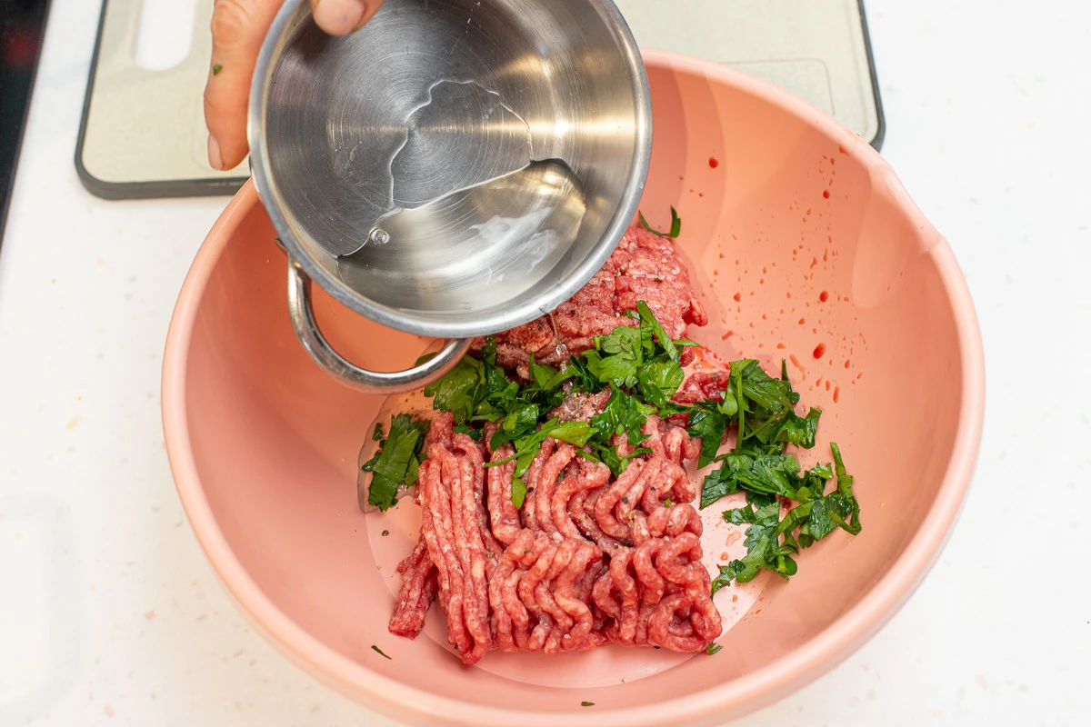Налейте в фарш 50-100 мл холодной воды, чтобы он стал сочнее. Хорошо перемешайте.