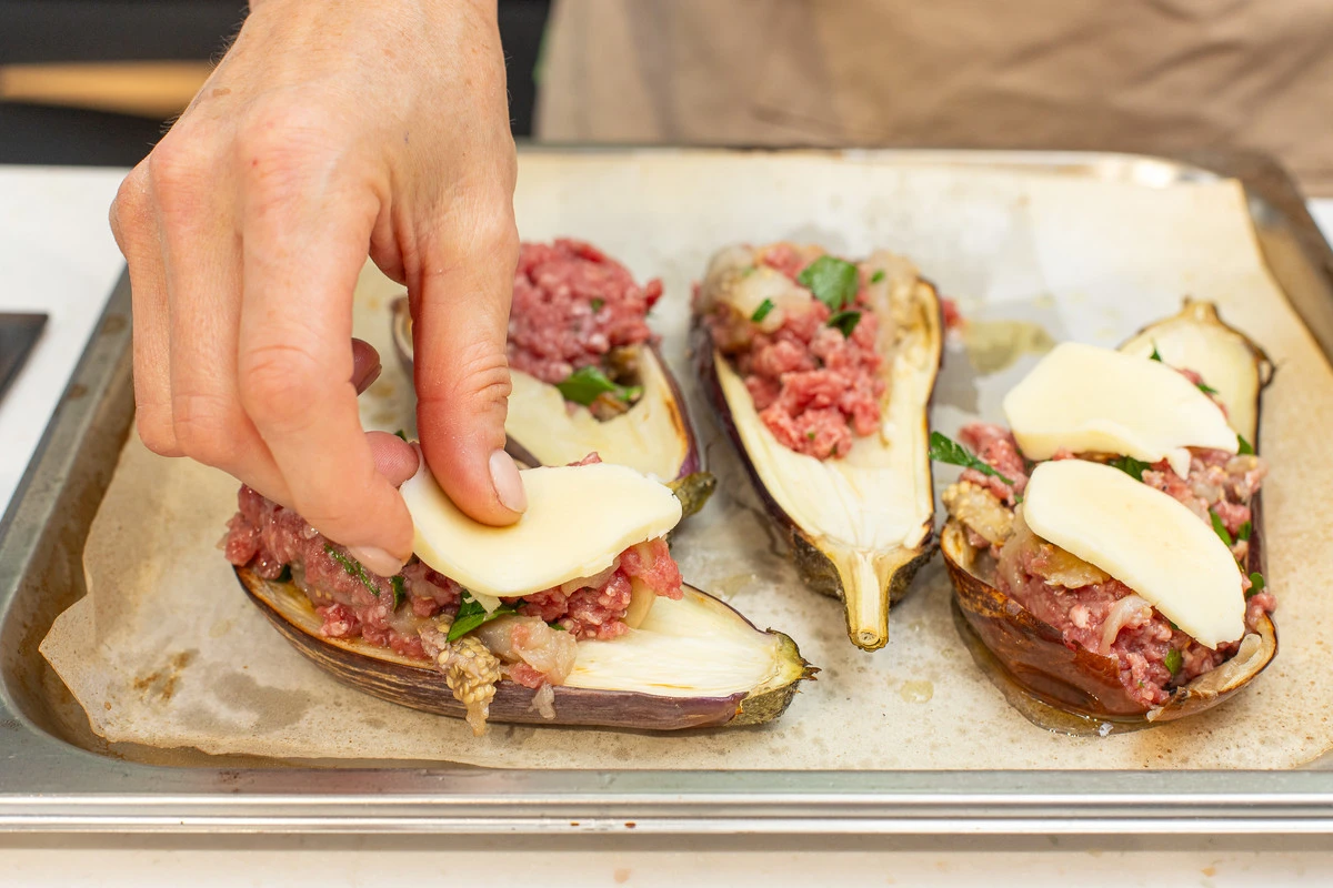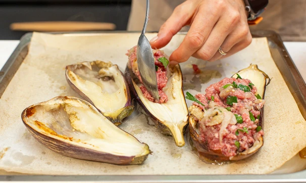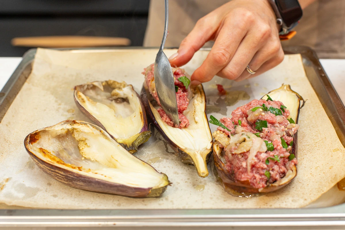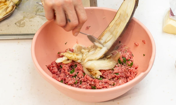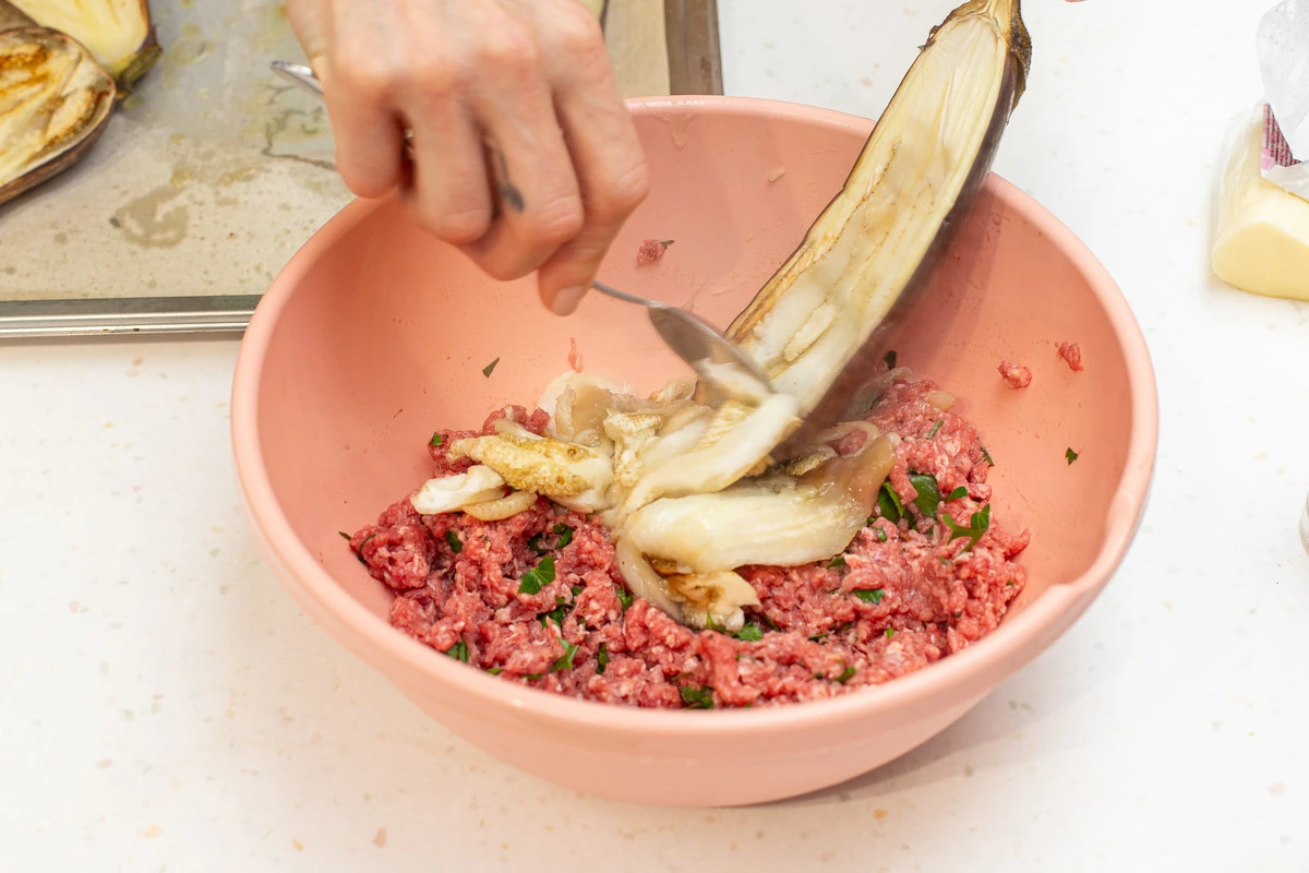 Достаньте из духовки запечённые баклажаны. Стараясь не повредить кожицу, аккуратно выньте ложкой мякоть, по желанию можете нарезать её. Кожицу сохраните. Добавьте мякоть баклажанов в фарш и перемешайте.